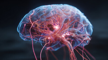 A visually striking image of the human brain with a network of blood vessels and neural connections. The brain is depicted with translucent texture