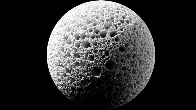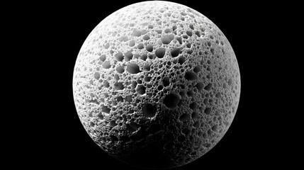 A detailed microscopic view of a porous, cratered sphere, evoking a sense of texture and depth. The sphere is gray against a dark background, highlighting the intricate surface details
