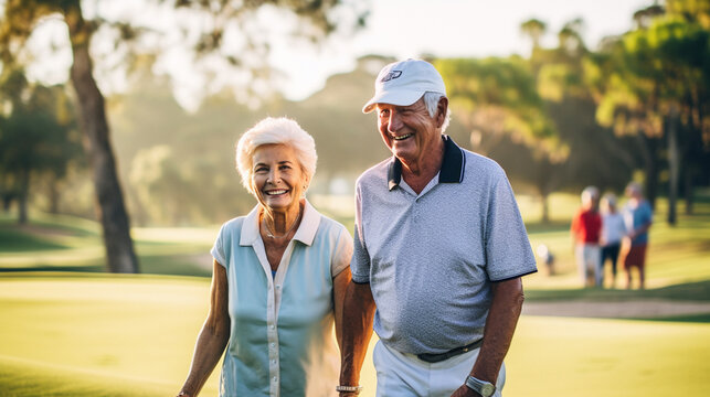 Two retirees playing a round of golf, showcasing their skill and camaraderie on the fairway, elderly couples