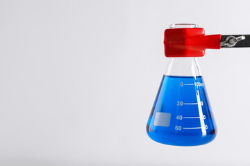 Retort stand and laboratory flask with liquid on light grey background, closeup. Space for text
