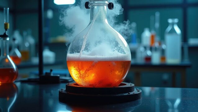A high-resolution photo of a laboratory retort with liquid boiling.