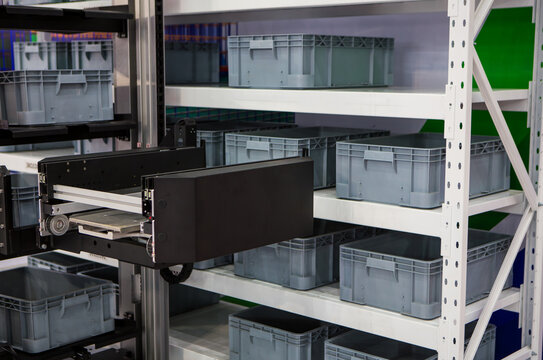 Vertical storage ergonomic solution. Automated storage and retrieval system. Modern industrial warehouse.
