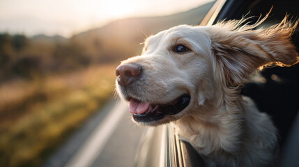 Happy golden retriever mix dog with ears flapping in the wind, head out of a car window, enjoying a drive on a sunny day.