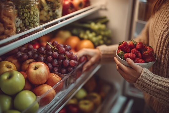 Woman retrieving a bowl of fresh fruits from a well-stocked fridge in a cozy kitchen