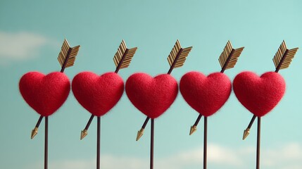 A row of five red hearts with arrows pointing to them. Concept of love and affection, as the hearts are a symbol of love