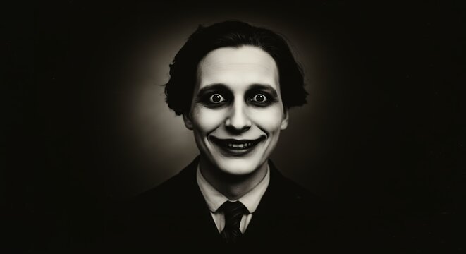 Smiling Man with Clown-like Makeup and Suit Against a Dark Background
