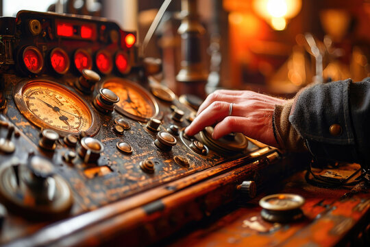 Close-up of a hand adjusting dials on a vintage control panel with gauges, conveying a sense of navigation and operation.