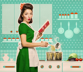 Woman in Retro Dress Cooking on Teal Gas Stove in Vintage Kitchen