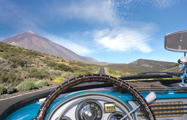 Worn brown leather driving glove on dusty vintage car dashboard with wood trim