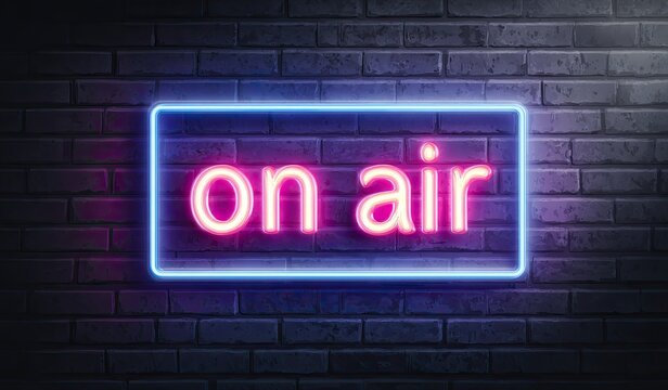 A bright red neon 'ON AIR' sign glows on a dark, textured wall. It symbolizes a live broadcast or recording