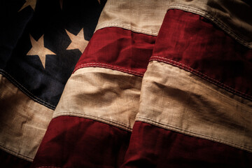 Close-up of the grunge flag of the Soviet Union. Dirty USSR flag on a metal surface.