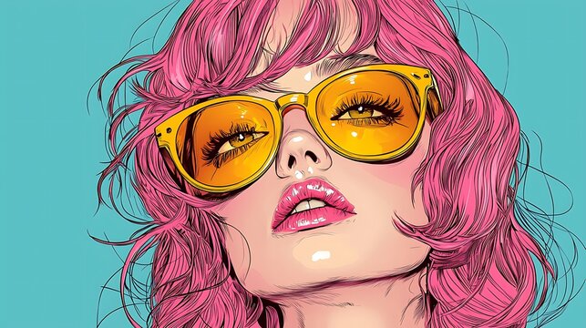 A pop art woman with pink hair and yellow sunglasses, exuding boldness and retro flair.