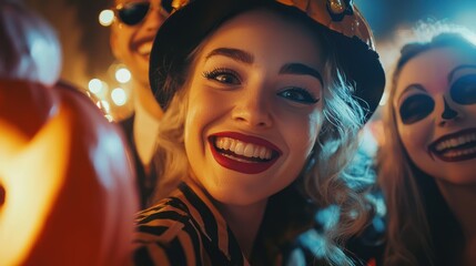 A close-up of a group of friends dressed in vintage Halloween costumes, celebrating the holiday with a retro flair