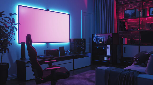 Immersive Gamer's Room Mockup: Blank Screen on Wall with Gaming Concept