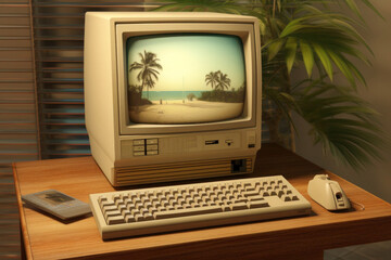 Vintage personal computer on desktop, close up. Retro style background with pc from 80s. Nostalgia concept
