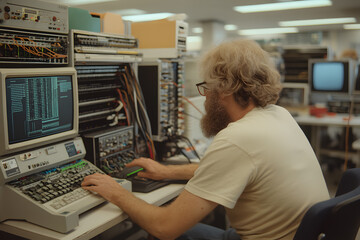 Dedicated Engineer Working on a Retro 90s Computer, Vintage Technology and Tech Enthusiast