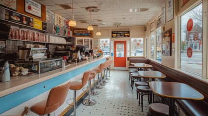 A retro diner interior with red booths, checkered floor, and vintage decor. Large windows provide natural light, creating a nostalgic atmosphere.
