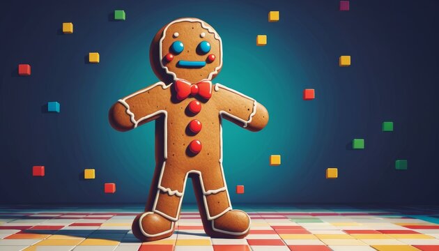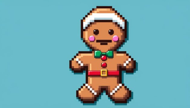 a gingerbread man decorated for the holidays with 8-bit retro gaming graphics