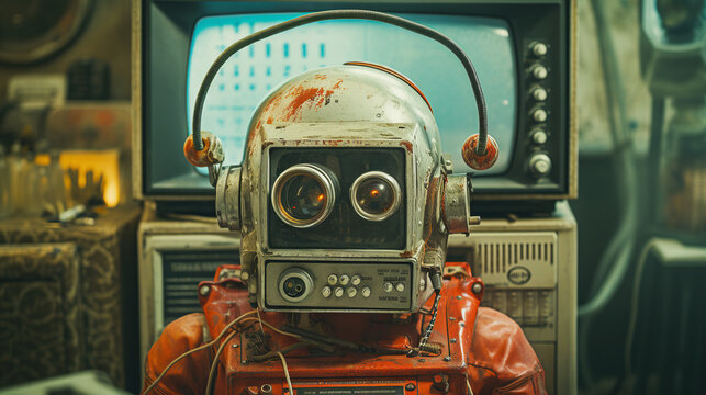 A futuristic cyborg with a retro TV head in a neon-lit cityscape, showcasing cyberpunk aesthetics