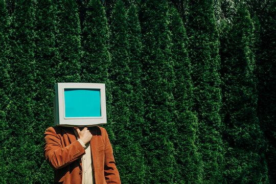 Person with retro computer monitor head outdoors thinking about digital identity