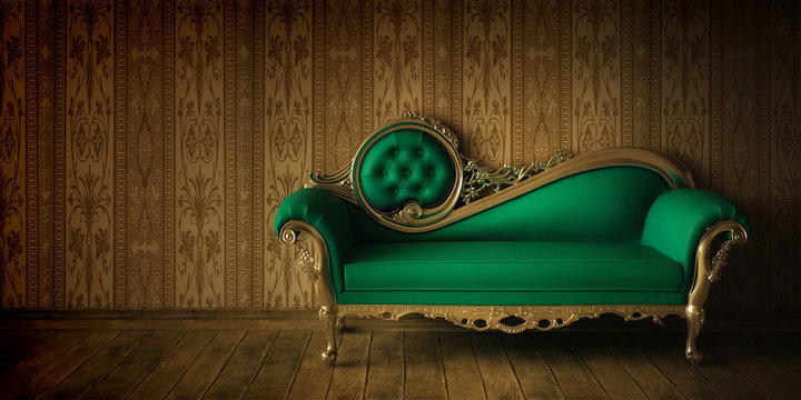 Luxurious bright Rococo interior with a large sofa and stucco on the walls. Selective focus.