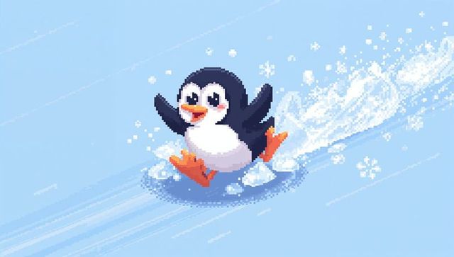 Pixel-art penguin sliding on ice with snow trail and playful motion streaks