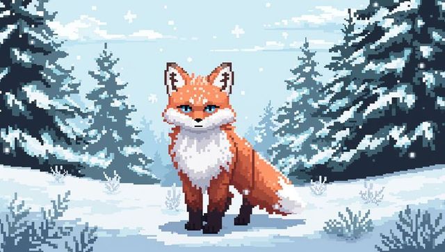 Pixel-art red fox standing in snowy evergreen forest, retro winter game background scene
