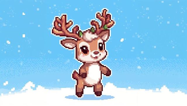 Leaping 8-bit reindeer sprite with pixel snow floating above shadow on pastel gradient