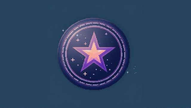 Pixel art star badge glowing on teal canvas, retro game emblem with purple peach glow