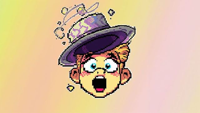 Shocked pixel avatar floating with purple fedora and round glasses on pastel gradient