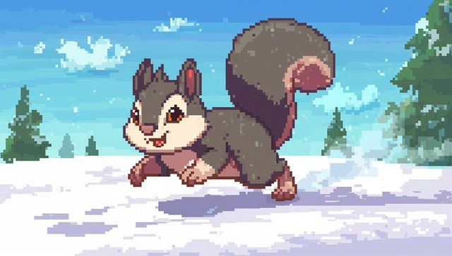 Pixel-art gray squirrel running across snowy forest with fluffy tail