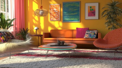 Cozy retro living room with a shag carpet, bold-colored furniture, and a funky 60s-style coffee table