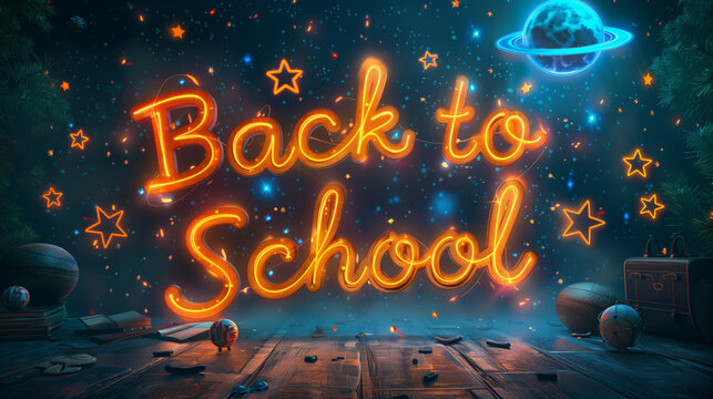 A glowing neon sign that reads Back To School is displayed in a space-themed setting with stars and a planet.