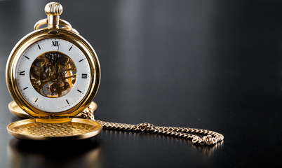 The white dial face of an antique round pocket watch with hands and numbers. Close up of a black and gold retro watch with golden hands. Luxury aged timepiece. Mechanical old metal clock.