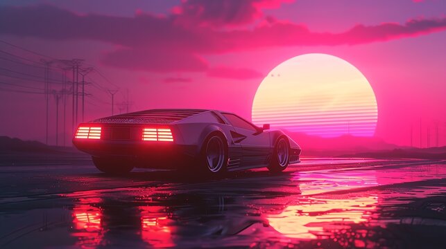 A retrofuturistic car drives towards a glowing sun in a synthwave style.