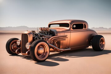 A retrofuturistic hot rod in matte copper with exposed engine parts and flame decals, AI Generated