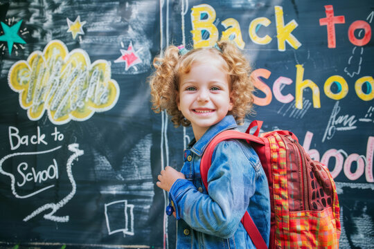 Smiling girl with a backpack standing in front of a colorful back to school chalkboard