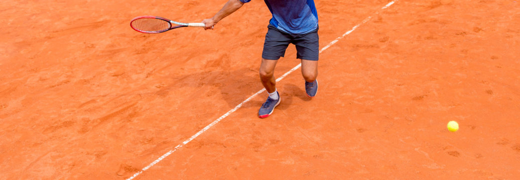 Male tennis player in action on the court on a sunny day. Background for tennis school banner. Individual sport concept