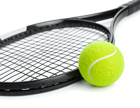 Black Tennis Racquet and Bright Yellow Tennis Ball Isolated