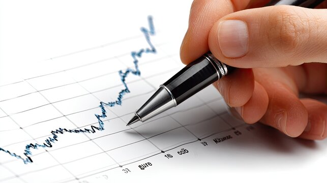 Financial Analysis: A close-up shot of a hand meticulously traces an upward-trending financial graph with a pen. The image embodies the concepts of strategy, insight.