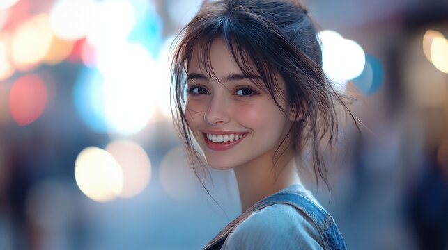 Sideways shot of beautiful woman happy to return after job interview smiles toothily glad to have holidays in foreign city solo vacations wears casual clothes poses against blurred background.