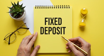 Overhead shot of notebook with fixed deposit, succulent, hourglass and hands