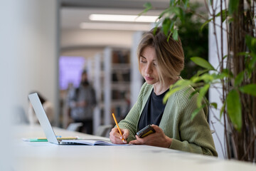 Confident young woman in casual clothes is walking through a city park holding laptop, returning to work or school, with green trees and modern glass buildings in the background on sunny day