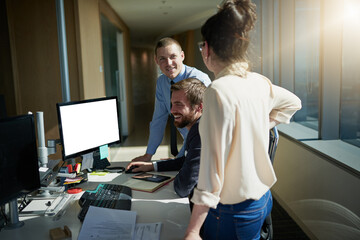 Team, computer and business people in office for meeting with advice, review or feedback on project. Collaboration, group and financial risk managers analyzing investment profit return or growth.