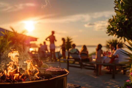 Group of people enjoying a sunset beach barbecue, gathered around a fire and socializing with the ocean in the background.