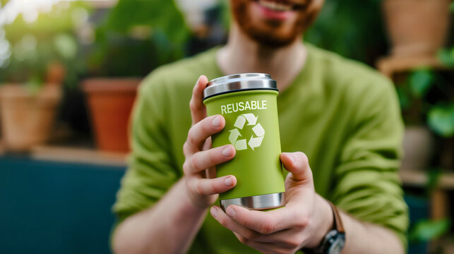 Young woman relaxing outdoors holding reusable cup with straw