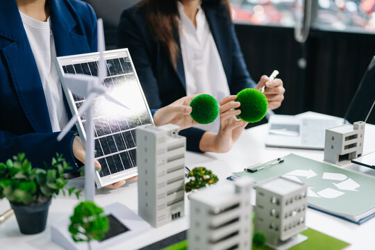 Group of business people planning and discussing on recycle reduce reuse policy symbol in office meeting room. Green business company with eco-friendly waste management regulation concept.Trailblazing