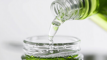 Eco-friendly concept: close-up of bottle being refilled with green liquid for sustainability and reuse