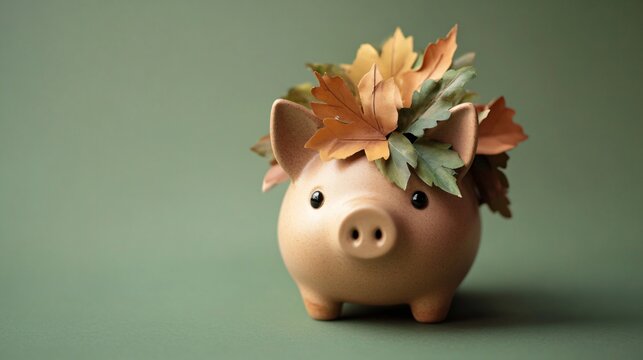 Eco-friendly piggy bank with leaves and earthy tones, symbolizing sustainable saving, isolated on a natural green background