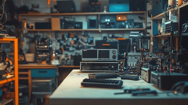 the impact of AV equipment rental on the circular economy and sustainable development. The image features well-maintained AV devices in focus, emphasizing their extended lifespan. In the background,